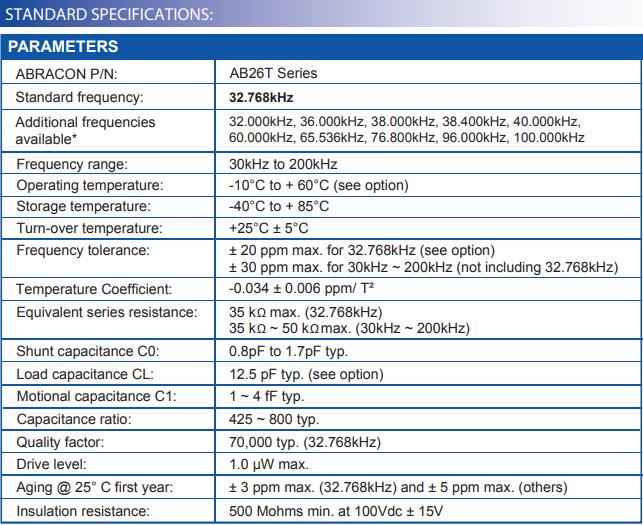AB26T晶振常用頻率為32.768KHZ,也可以做32.000kHz, 36.000kHz, 38.000kHz, 38.400kHz, 40.000kHz, 60.000kHz, 65.536kHz, 76.800kHz, 96.000kHz, 100.000kHz等頻率,最高可達200KHZ。有需要的朋友可以來電咨詢訂做:0755-27872782,或者是直接進入晶振官網(wǎng)與我們聯(lián)系:http://m.nj-car.cn