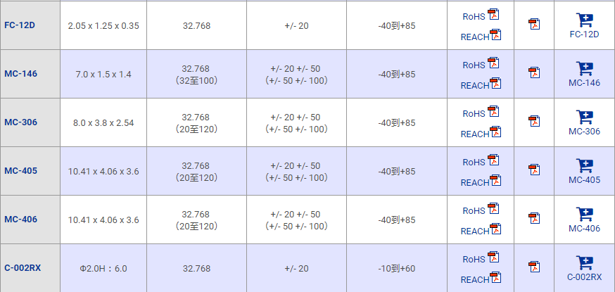 | 晶振型號編碼 | 尺寸(長寬高) | 型號 | 頻率 | 負載電容 | 頻率偏差 | 工作溫度 | ESR阻值 |