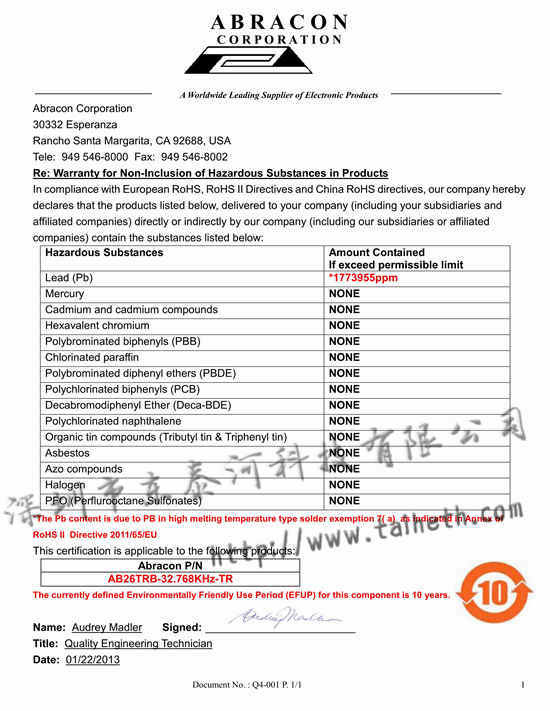 以下資料是AB26TRB晶振的歐盟ROHS相關(guān)證明書。