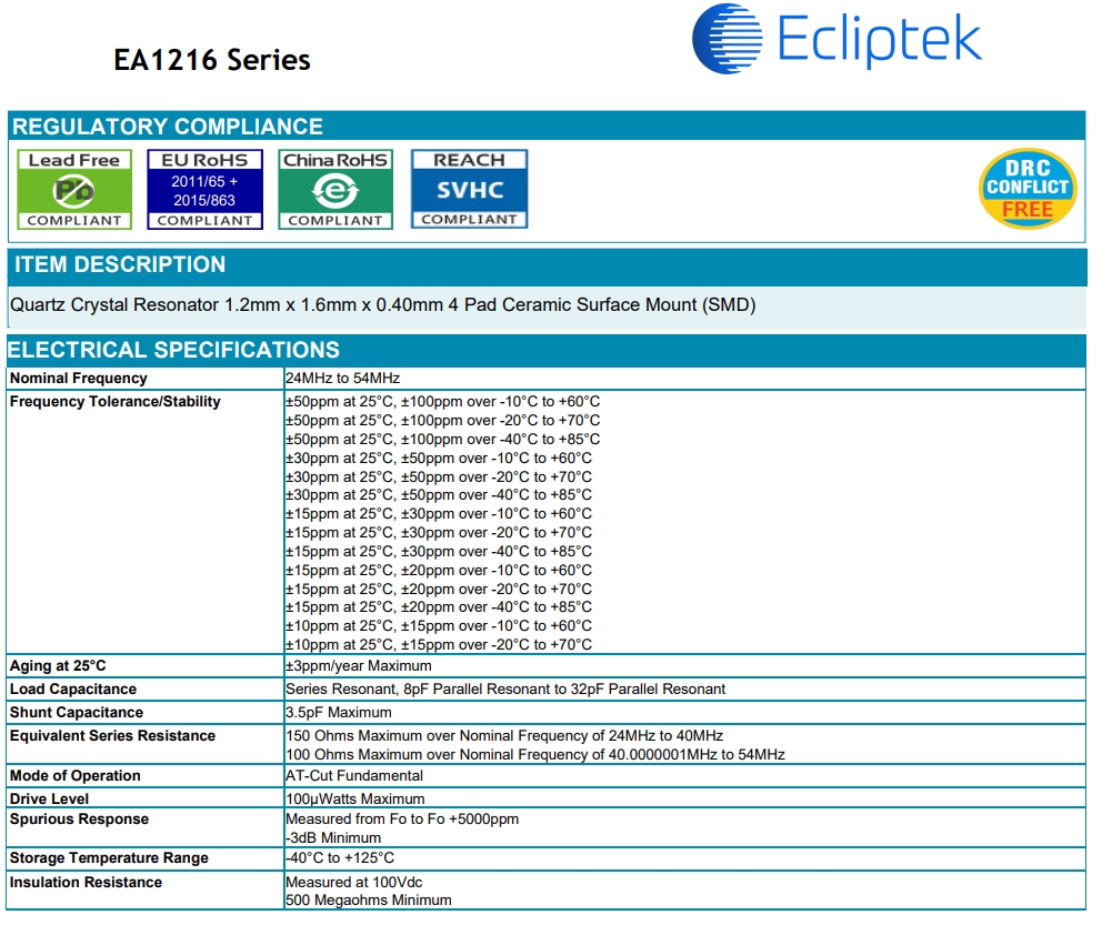 EA1216MA08-25.000M TR|EA1216晶振|無源晶振,物料編碼EA1216MA08-25.000M,型號(hào)EA1216,頻率25MHZ,精度±20ppm,負(fù)載電容8PF, 尺寸: 1.6*1.2*0.4mm,溫度范圍:-40℃-85℃,SMD晶振,歐美進(jìn)口晶振,無源晶振,石英晶振,ECLIPTEK晶振,晶振廠家,石英晶體諧振器,應(yīng)用于錄音筆,微型攝像頭,智能手機(jī),網(wǎng)卡,衛(wèi)星電話,ETC機(jī)器.