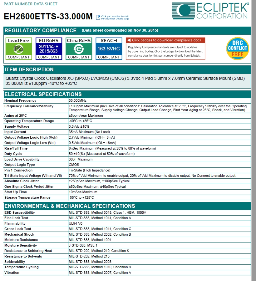 EH2600ETTS-33.000M|3.3V晶振|SPXO晶振,物料編碼EH2600ETTS-33.000M,頻率33MHZ,精度±100ppm,負(fù)載電容30PF, 輸出LVCMOS 60%,尺寸: 4-Pin CSMD Bulk,溫度范圍:-40℃-85℃,電壓3.3V,SMD晶振,有源晶振,SPXO晶振,歐美晶振,晶振,石英晶體振蕩器,LVCMOS 60%差分晶振,ECLIPTEK晶振,特點:輕型,薄型,小型,低抖動,低功耗,低差損,應(yīng)用于車載音響,車載顯示系統(tǒng),車載防盜系統(tǒng),車載GPS.