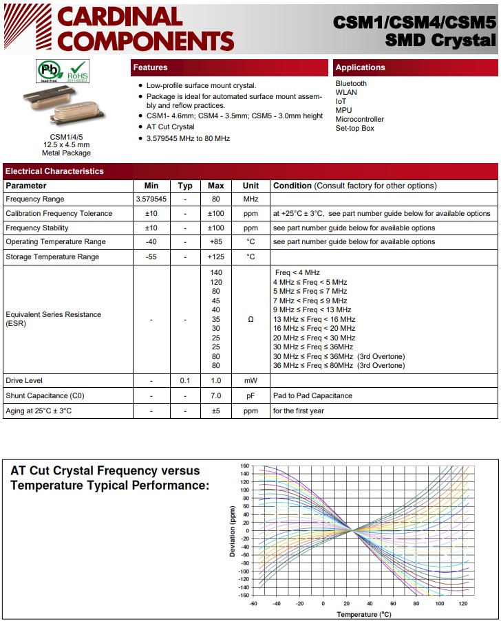 美國Cardinal卡迪納爾晶振CSM系列,CSM1:13x4.7x4.6毫米,CSM4:13x4.7x3.5毫米,CSM5:13x4.7x3.0毫米,是一款SMD石英晶體,兩腳貼片晶振,石英晶振,無源晶振,石英晶體諧振器,無鉛環(huán)保晶振,薄型表面貼裝水晶,封裝是自動(dòng)化表面安裝組裝和回流實(shí)踐的理想選擇,CSM1-4.6毫米;CSM4-3.5毫米;CSM5-3.0mm高,AT切割水晶,頻率范圍:3.579545MHz至80MHz。應(yīng)用于:藍(lán)牙,汽車音響控制器,無線局域網(wǎng),物聯(lián)網(wǎng),微處理器(Microprocessor Unit),微型控制器,機(jī)頂盒。汽車音響控制器應(yīng)用晶振CSM4Z-A2B3C3-40-25.0D18-F