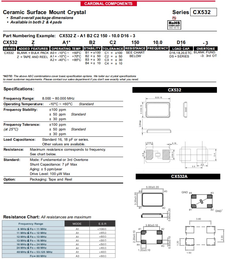 | CX532Z-A2B3C5-70-16.0D18 | Cardinal晶振 | CX532 | MHz Crystal | 16MHz | ±30ppm |