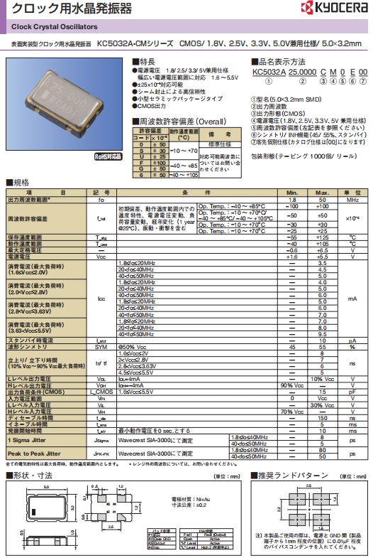 | KC5032A30.0000CM0E00 | AVX Corp/Kyocera Corp | KC5032A-CM, Kyocera | Active | 30MHz | 1.6 V ~ 5.5 V | -10°C ~ 70°C |