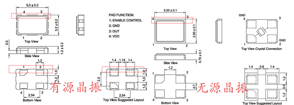 查看大圖可以清楚的看到做出標(biāo)記的地方是有些區(qū)別的,先看正面,左圖有明顯的凹凸不平,而右圖卻一馬平川,再看下面的腳位圖也是如此.則可以得出這么一個(gè)結(jié)論,有源晶振的外觀是有"缺陷"的(凹凸不平的),無源晶振則是一條線,概括一句話就是直.