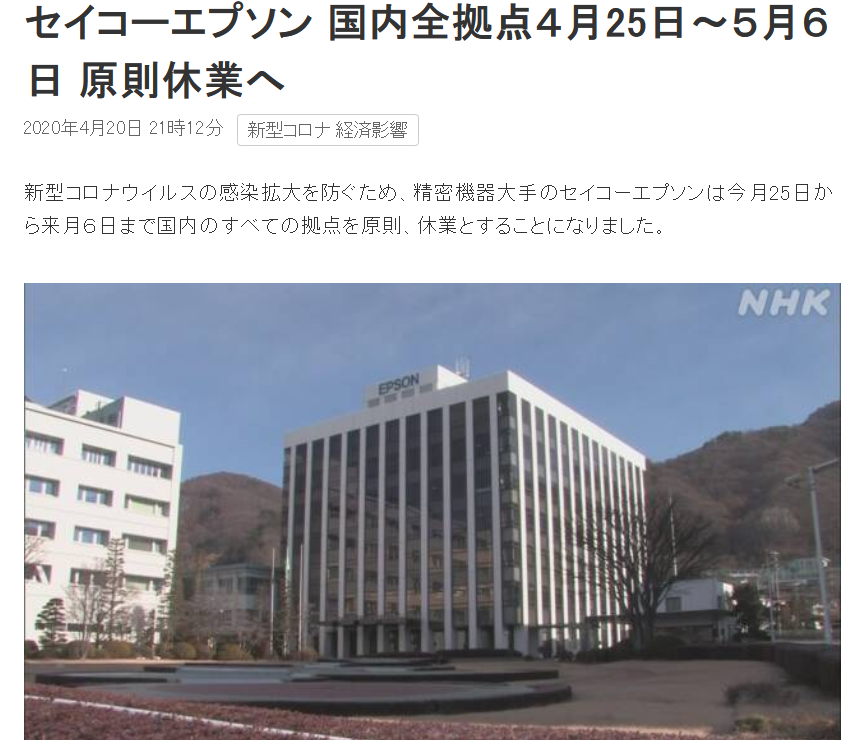 セイコーエプソン株式會社(以下エプソン)は、日本政府による「緊急事態(tài)宣言」の全國拡大を受け、エプソングループの國內(nèi)拠點(diǎn)を4月25日(土)から5月6日(水)まで休業(yè)することとしました。