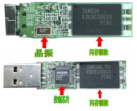 我們了解一下閃存內(nèi)部的結(jié)構(gòu),分為PCB,也就是印刷電路板,上面有閃存顆粒,控制芯片,晶振等元件。其中PCB上面的閃存顆粒就是起到存儲(chǔ)數(shù)據(jù)的作用;而晶振是用來(lái)產(chǎn)生原始的時(shí)鐘頻率,這個(gè)頻率會(huì)通過(guò)時(shí)鐘放大器變成我們常見(jiàn)的各種總線頻率,在我們的電腦主板很常見(jiàn),另外玩具手表,電子跳繩,手機(jī),計(jì)算機(jī),安防,汽車等產(chǎn)品都可以見(jiàn)到??刂菩酒瑒t是閃存卡中起著決定性作用的東西。比如我們這個(gè)閃存是USB2.0的,速度最高可以達(dá)到多少都是由它說(shuō)了算。此外,一些PCB板,電容,電阻之類的小元件質(zhì)量則是與做工用料有關(guān)??从疫呥@張圖,你就明白它的內(nèi)部結(jié)構(gòu)了。