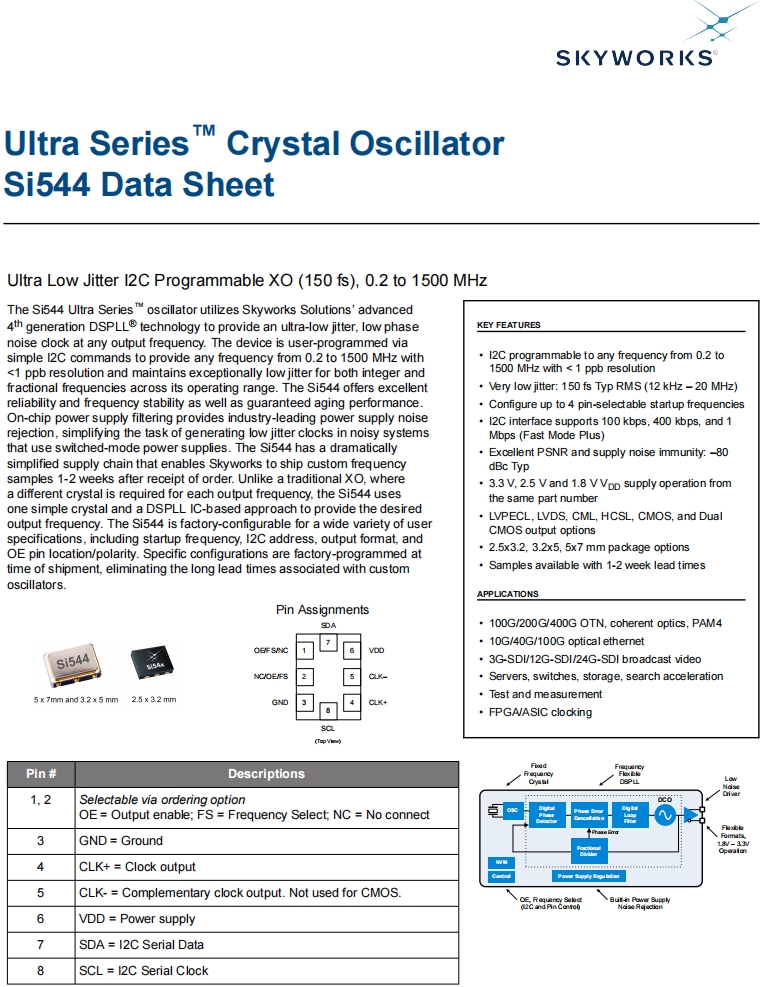 | 544BCAA000126BBG | Skyworks Solutions Inc. | Ultra™ Si544 | 200 MHz | LVDS | 1.8V, 2.5V, 3.3V |