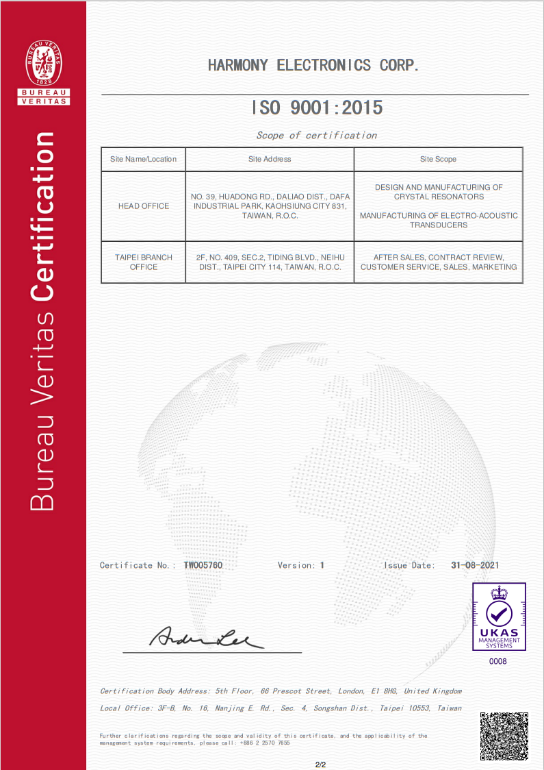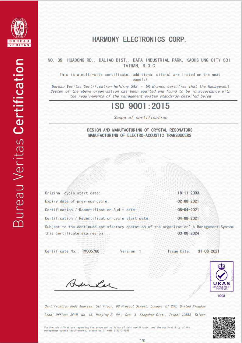 臺(tái)灣加高晶振公司通過ISO 9001:2015認(rèn)證,X1H024576DK1H-X晶振,必維國(guó)際檢驗(yàn)集團(tuán)認(rèn)證控股公司SAS – 英國(guó)分公司證明管理層上述組織的系統(tǒng)已經(jīng)過審核,晶體諧振器的設(shè)計(jì)和制造符合管理體系標(biāo)準(zhǔn)的要求,詳述如下