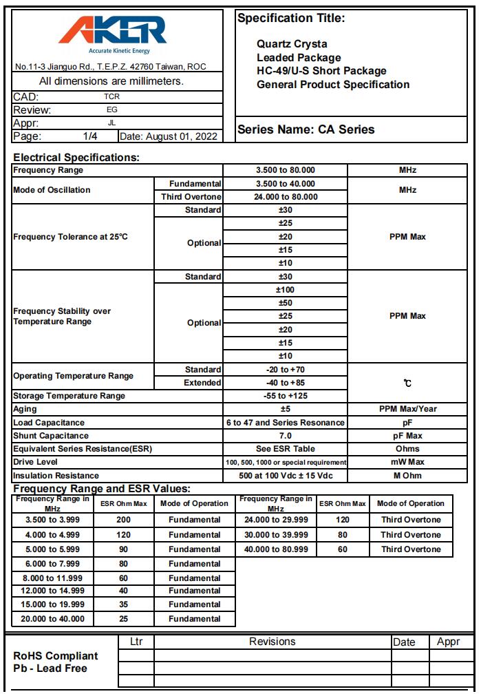| Mode of Oscillation | Fundamental | 3.500 to 40.000 | MHz |