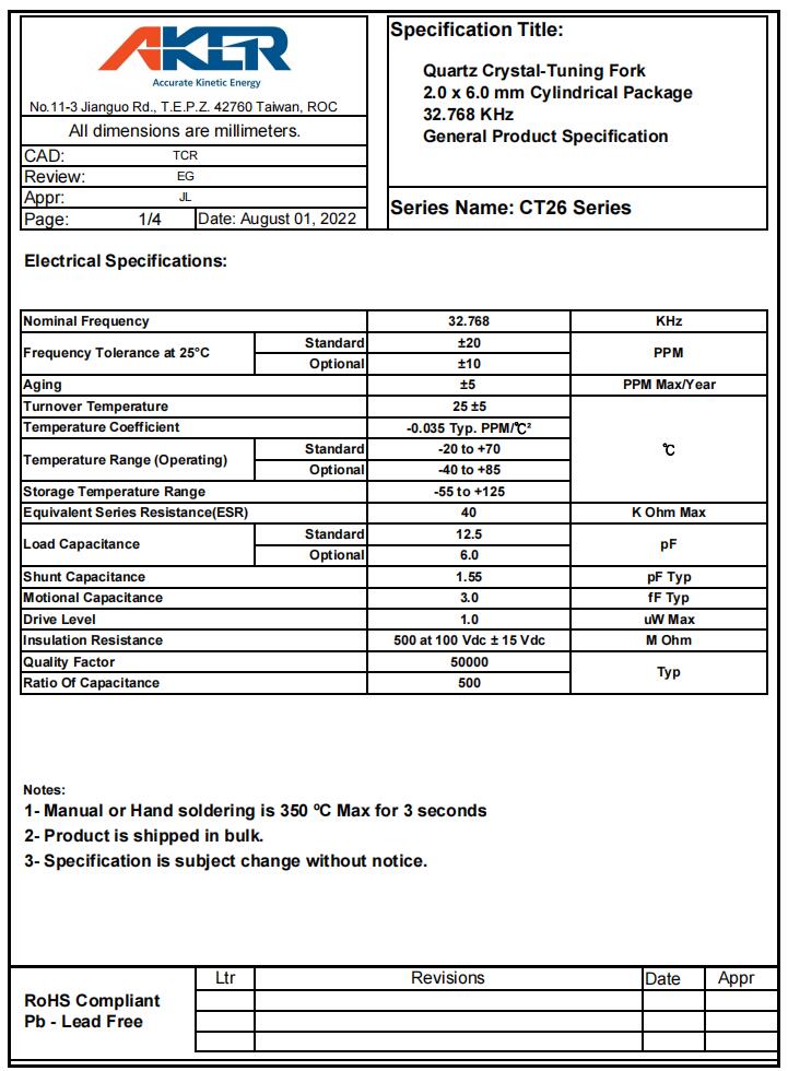 CT26-32.768-12.5-20-X|32.768KHz|12.5pF|AKER品牌規(guī)格表