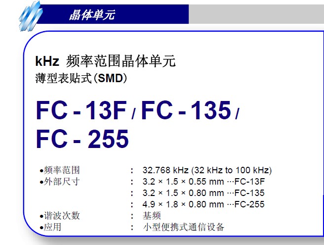 • "FC-135 32.7680KA-A3",晶體產(chǎn)品可能會在某些條件下受到損壞。例如從桌上跌落或在貼裝過程中受到?jīng)_擊。如果產(chǎn)品已受過沖擊請勿使用。