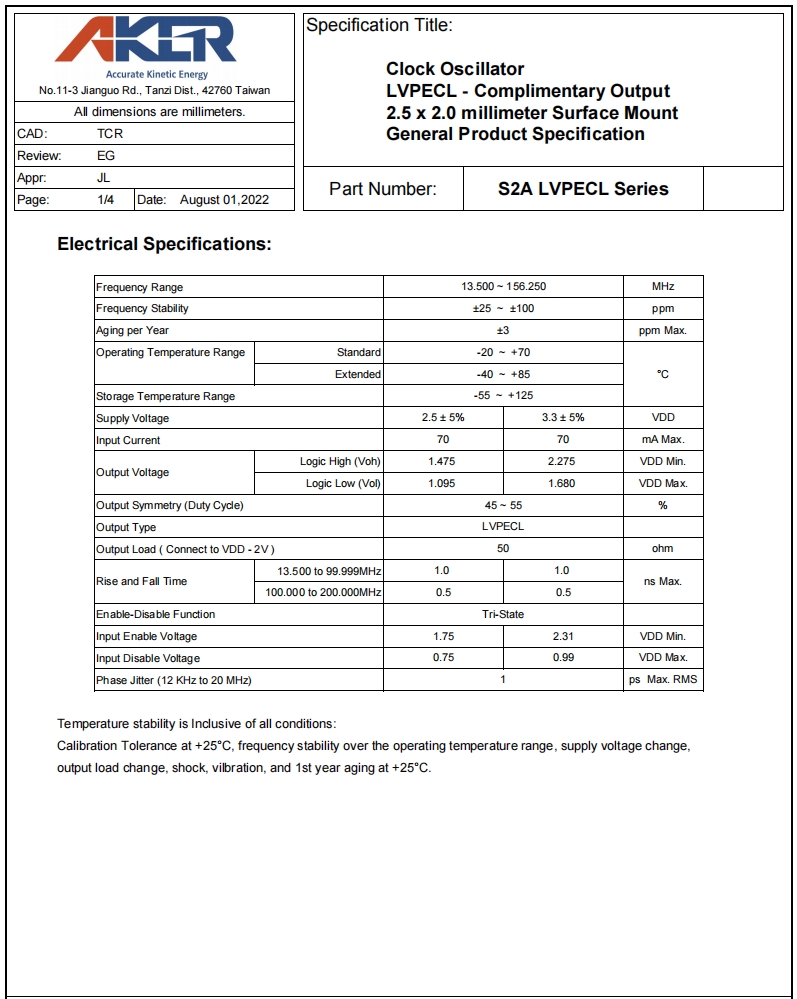 S2A2505-156.250-P-X-R|156.25MHz|2.5V|臺灣AKER晶振規(guī)格表